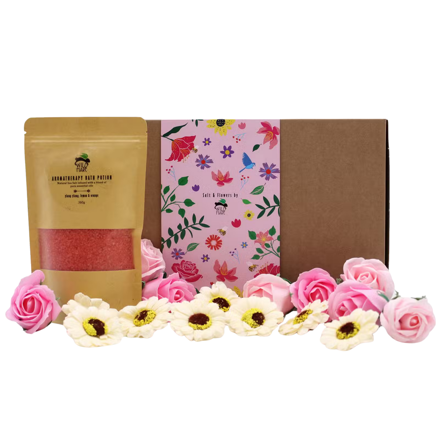 Ce coffret prêt à offrir contient une sélection de fleurs de savon artisanales et de sels de bain détoxifiants infusés aux huiles essentielles de Litsea Cubeba, Tea Tree et Genévrier.